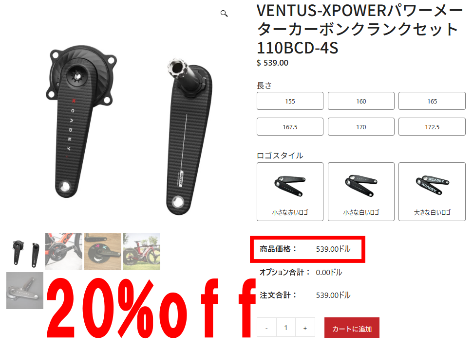 最も売れているXCADEYオリジナルのカーボンクランクとパワーメーターセットで66,000円代(20%off、155円計算)は相当お安い。一般的に国内でカーボンクランクとパワメセットだと10万円は軽く超えてくる。国内の安心感を選ぶか海外サイトの安さを選ぶかは人それぞれで正解も人それぞれ。