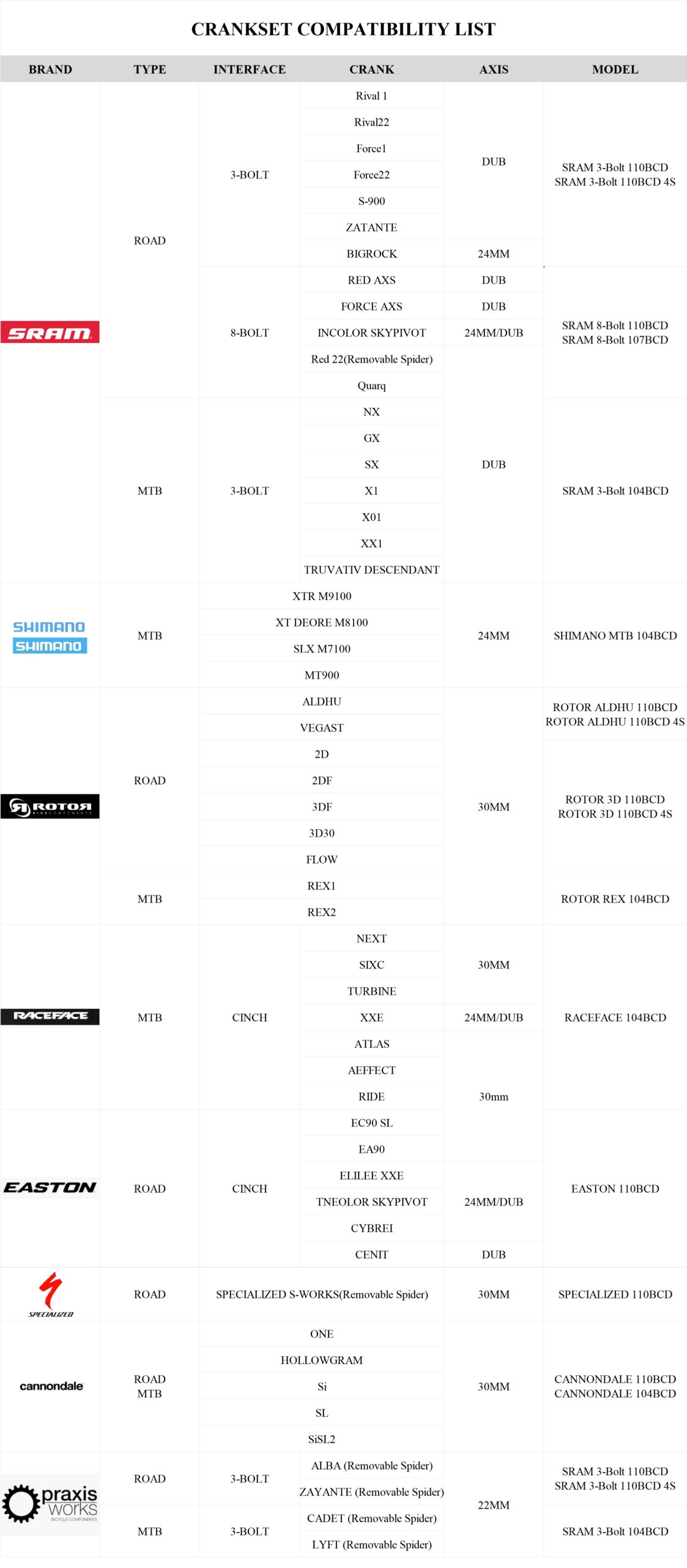 クランクセットとパワメの整合表になります。私はSHIMANOなのでEASTONの110BCDを使っています。